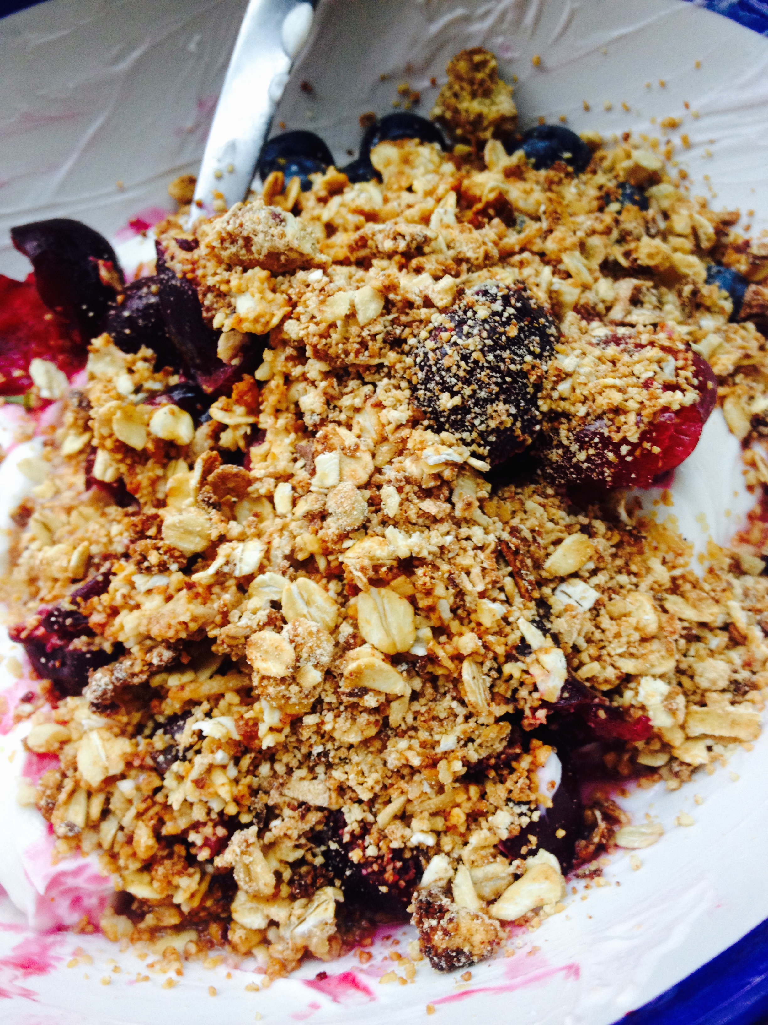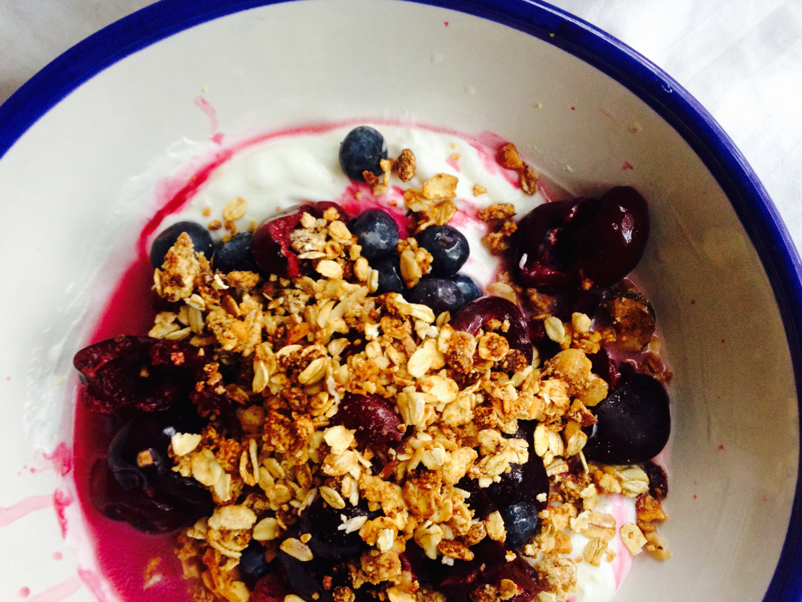 Then, I top it up. My favorite fruit to use in my parfaits are cherries, blueberries, strawberries, raspberries and mangos. The only fruit I wouldn’t recommend is banana because of texture with the yogurt — too mushy. And this is not your momma’s parfait.