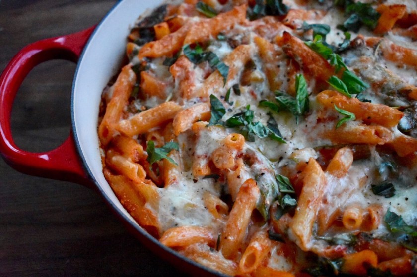 It’s the same idea as the classic Italian American baked ziti, but with greens and ziti’s sophisticated cousin penne for a virtuous upgrade.