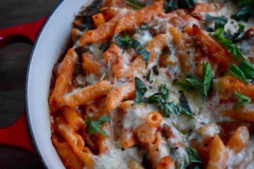 With the holidays around the corner—which means quality family time, and therefore implies entertaining and cleaning—I also love this dish because of its simplicity. It only takes one pot (plus one for boiling pasta, but that hardly counts) and it satisfies even the most ravenous. Plus, it looks pretty and elegant for being a simple baked pasta.
